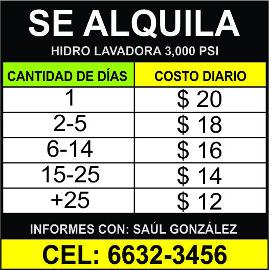 • Para informes y alquilar equipos, contacte a Saúl González al celular 6632.3456.